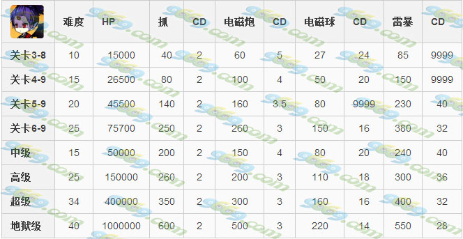 | 爆率 | 中级 | 高级 | 超级 | 地狱级 |