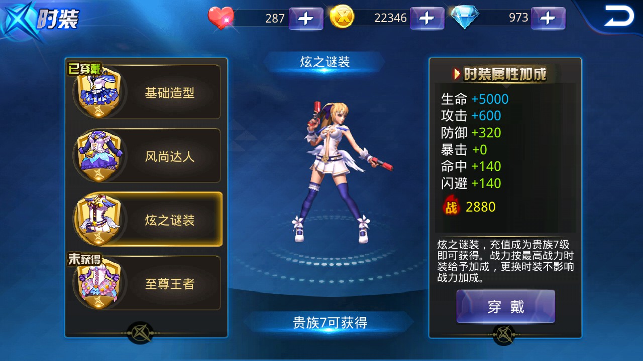 获得方式:贵族等级达到7时便可以获得,或使用5个时装碎片去炫斗之城的凯利那里兑换七天的炫之谜装体验卡。