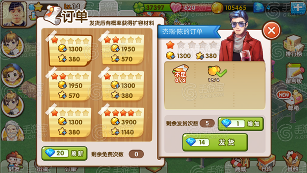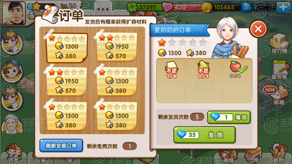 1.一次性可接订单量为6个。也就是说玩家可以有选择性的接订单,也可以全部接完。而免费刷订单的次数每天也只有1次。所以小编建议,当大部分订单都为1个星难度的时候,才使用免费刷订单。这样基本上能保证当日的订单最大收益。