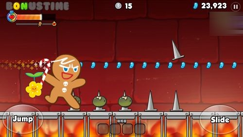 与一般跑酷游戏很类似的是,《姜饼人酷跑》的游戏过程中会施放各式药水,姜饼人在奔跑中吃到之后可以短暂的发挥效果。例如可让姜饼人变大的放大药水,放大期间什么障碍都会被扫除;还有让障碍物变银币的药水,也可让障碍物变得平易近人。此外还以加速药水、磁铁药水等等。但最重要的就是生命药水,若是跑到一半没有生命力了,姜饼人就会倒地不起。在游戏里,吃到更多的药水能够减少游戏的难度,获得功能增益,实在是跑得更远的不二之选啊。其实《姜饼人酷跑》是一款非常好打发时间的休闲游戏,每一回合都短短的,上厕所的时候可以偷玩几回。