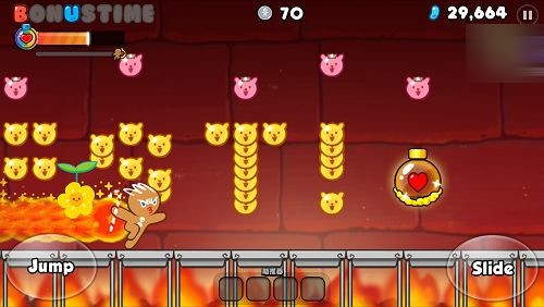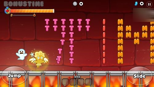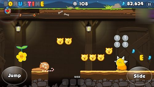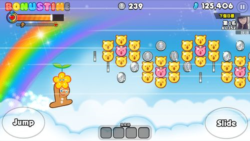 《姜饼人酷跑》还有一个相当有趣的特色,这就是相当受欢迎的Bonus Time元素。在姜饼人跑动的过程中,搜集BONUS TIME这九个软糖后,就可启动Bonus Time,可让姜饼人飞到空中吃软糖,并且同时跑过一段不短的路程,虽然历时通常很短,但是却大大提高了得分以及跑的距离,跑动时一定别错过字幕软糖哦!