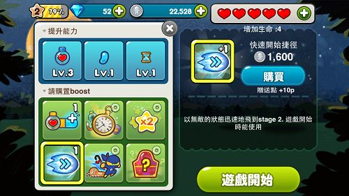 除了药水之外,也可购买道具,例如冲刺道具,让你一下子跑到第二阶段;或是体力强化药水,可延长跑动的体力,当然这也才能抢下高分,跟朋友对决。