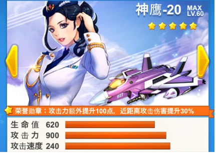神鹰-20,战机的攻击方式为全导弹攻击,左右两排的跟踪导弹更是不留落网之鱼。满级攻击力900,加上“荣誉勋章”技能所额外提供的100点攻击力提升,满级攻击力就将达到1000,是无可置疑的最强攻击者。另外在近距离攻击是伤害还将提升30%,在对付魔鬼阵列或被逼到绝境时绝对是不可或缺的神技。