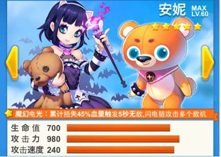 安妮,拥有活泼可爱的小萝莉外形。 满级生命值700的安妮,必将成为战机中最经得起“击打”的熊孩子。其累计损失45%血量后触发的5秒无敌,更是体现了魔熊保护安妮时的尽心尽力。