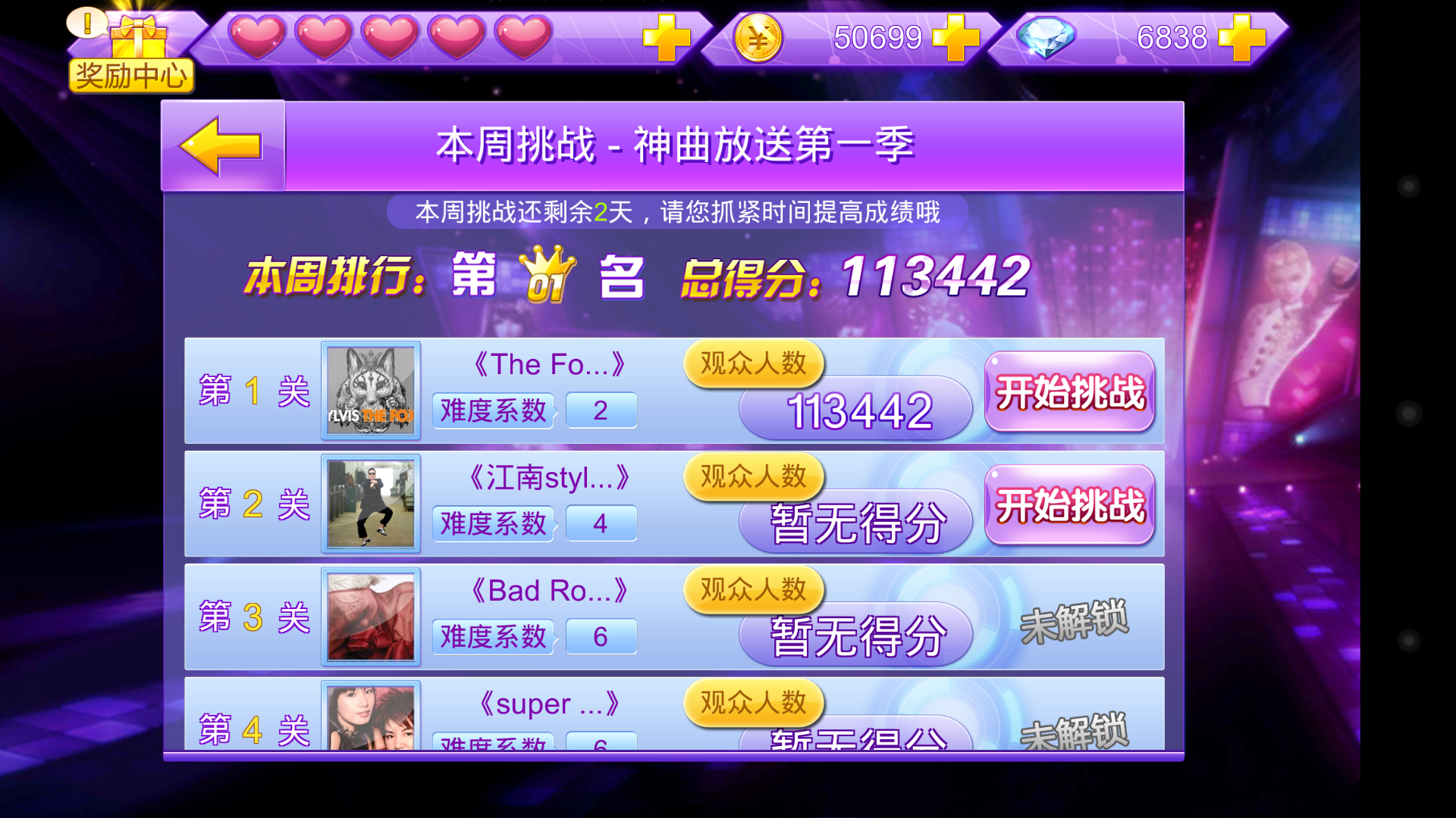 每周挑战设有周歌曲总分排行榜,立刻上线看看十首歌加起来能打多少分吧!