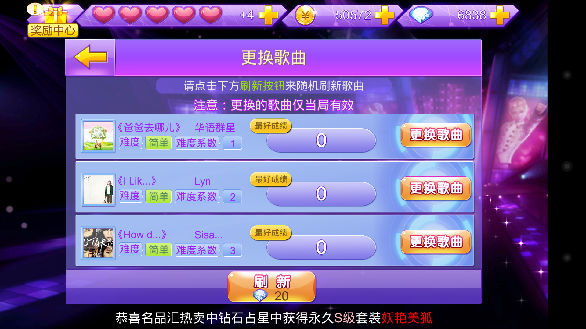 每周更新十首歌曲,从最简单到最困难,看看小伙伴们都能打到第几关!最新神曲、温柔情歌、影视金曲……每周围绕不同主题,总有一款适合你,更有更换歌曲功能,助你迅速提升挑战水平!