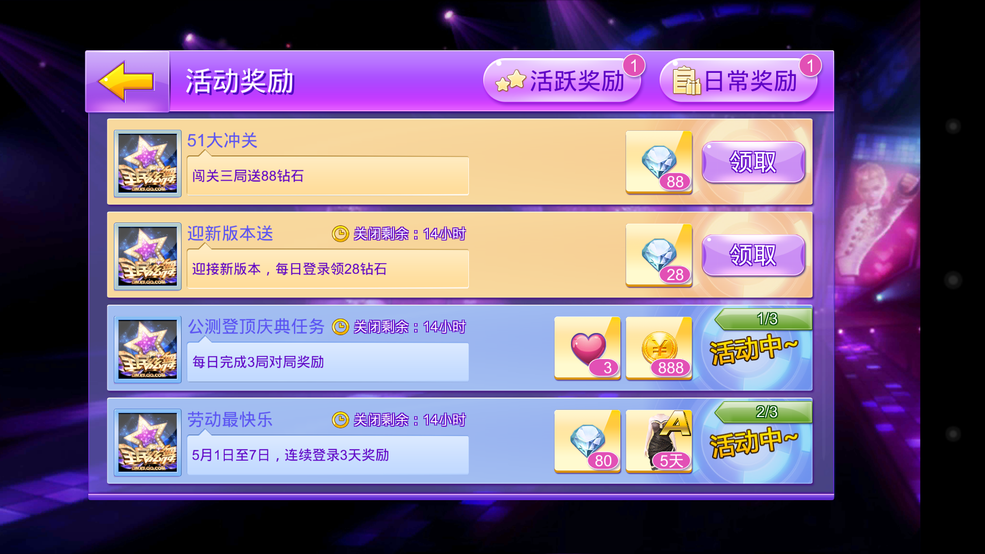 新增日常奖励系统,每天3个日常任务轻松到手15钻石!丰富活动不间断,更新就送钻石和衣服!