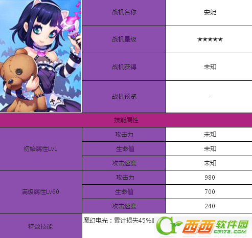 不得不说,满级安妮的攻击力980还是非常不错的,另外240的速度也算的上是优秀非常。同时700的生命值也保证了五星安妮的生存能力,由此可见,五星战机安妮是一款非常不错的新战机!