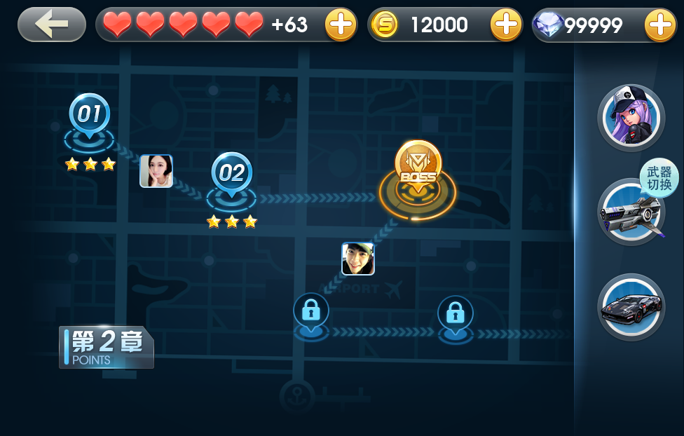 大地图分为6个章节(对应6个黑帮boss),每个章节有8个关卡,总计48关卡,玩家在每个关卡中,需要达成一定的目标从而完成关卡获得奖励。每个关卡又有 普通、一星、二星、三星 4个难度选择,难度越高奖励越多。 玩家首次通过关卡的每个难度都会获得一定的钻石奖励,此后反复通过会获得一定的金币奖励。