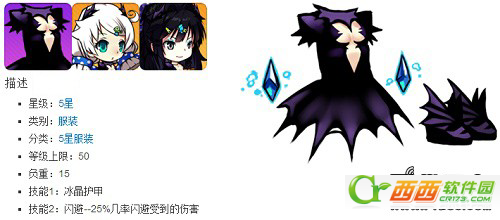 | 乌鲁德女神圣衣 | ★★★★★★ | 25 | 99 | 1381 | 12.755 | 冰晶护甲:角色受到近身伤害30%几率将身边敌人冰冻2.5秒 闪避:35%几率闪避受到的伤害 |