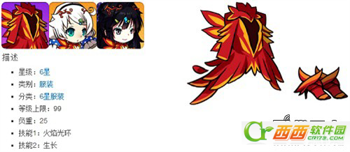 | 诗库璐德女神圣衣 | ★★★★★★ | 25 | 99 | 3399 | 31.388 | 火焰光环:角色周围半径250范围内的怪,每秒受到150伤害 生长:角色受到近身攻击时18%几率立即回复100HP(效果CD 0.5秒) |