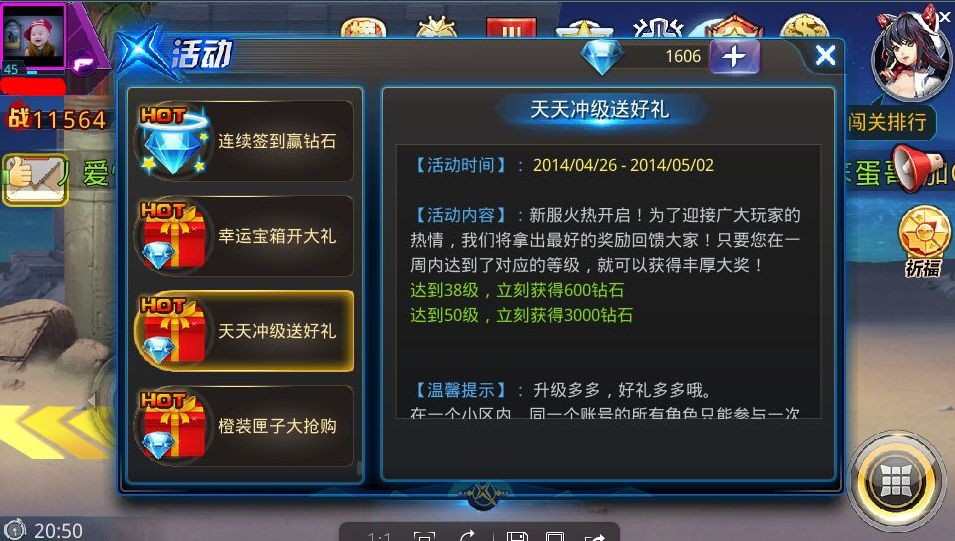 升级送钻石的规则为达到38级,送600钻石;达到50级,送3000钻石。同时需要满足:自开服起七日内完成才会送。这个在游戏内的【活动】面板是有倒计时的(如下图)。