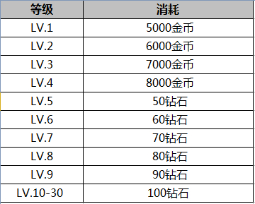 进击力1级到5级可以通过金币升级,第一次5000金币,然后每次增加1000金币,所以升级到5级需要26000金币。之后进击力升级需要消耗钻石。进击力5级升级需要50钻石,之后每次增加10钻石,到进击力10级后,每次升级都需要消耗100钻石。