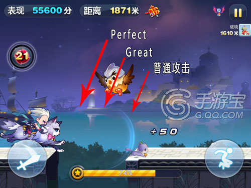 每次对怪物的攻击会有得分判定,由高到低分别为“Perfect”、“Great”和“普通攻击”,离得越近发动攻击评价越高,不同判定所获得的得分也有所不同。而这些判定的范围可以通过提升进击力等级来获得提升。