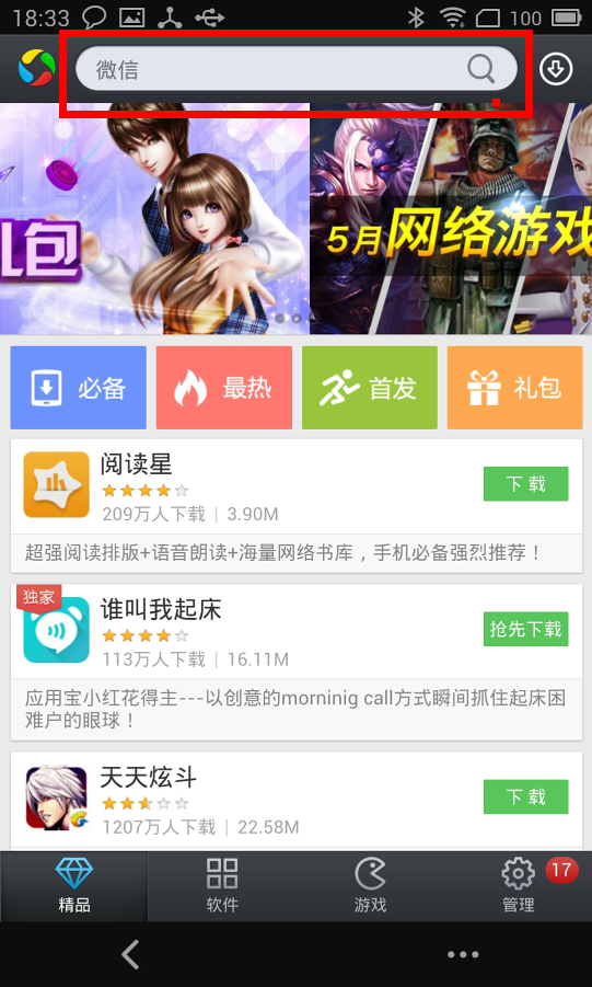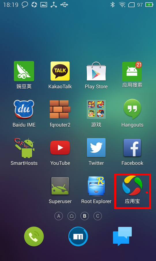 E. 当游戏包下载完成以后,下载安装一个“应用宝”软件: