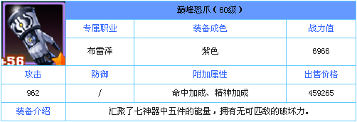 ![]() | 巅峰怒爪 | 60级 | 汇聚了七神器中五件的能量,拥有无可匹敌的破坏力。 |