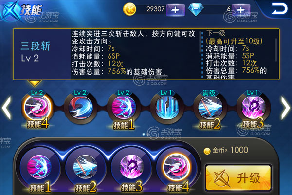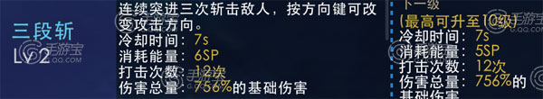 三段斩:LV2,756%的基础伤害,12段打击,三段斩的威力不是很大,但是可以利用此技能进行位置的移动,技能连击时可以作为接近敌人的调整距离的技能。