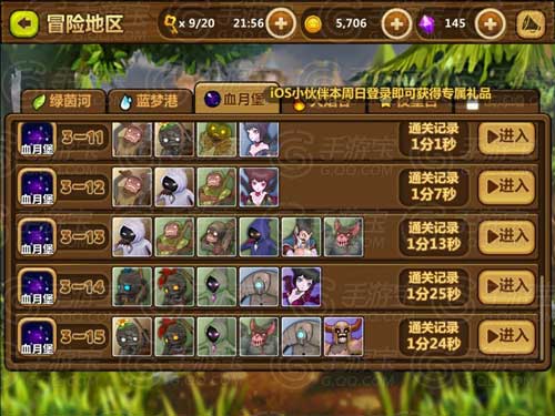 3-14我认为迄今3星爆率最高的地方(5-11后面我们平民也很难打的过去),我刷的不多,高手克雷德可以单刷 最后BOSS放技能就可以,1拖2没问题,没出双倍就刷出过一个3星怪+2个3星武器。