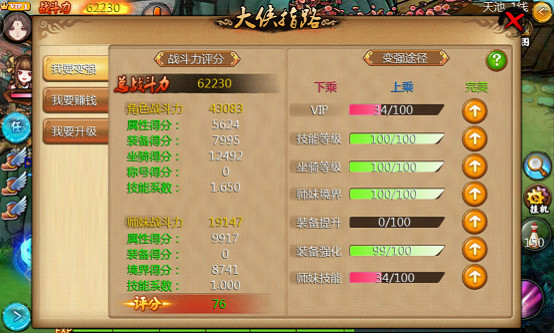 前面西西为玩家介绍过升级途径有哪些,接着来为新手玩家介绍放开小Q妹战斗力的提升方法。玩家总战斗力,小师妹战斗,和自身战斗力相加获得的, 因为坐骑战斗力已经附加到玩家身上,所以角色战斗力已经包裹了坐骑战斗力。