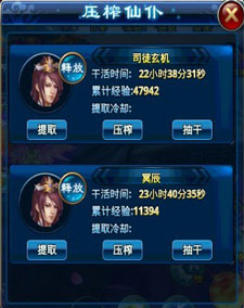4) 压榨仙仆:抓捕来的仙仆会自动开始干活,为仙主提供干活经验,仙主可以随时来提取这些经验,也可以对仙仆进行压榨或抽干,加快其干活效率,缩短干活时间。