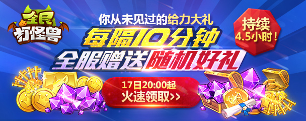 为了答谢一直以来各位小伙伴们对《全民打怪兽》的支持与喜爱,运营团队特策划“史上最强悍的活动”奉献给各位小伙伴!在5月17日20:00至5月18日0:30时间段内,只要完成相应操作,即可每十分钟获赠系统送出的随机神秘大礼!也就是说,在持续四个半小时的活动时间内,你可以领取28次随机大礼,小伙伴们是否已经不淡定了呢?Hold住,这是真的!
