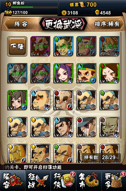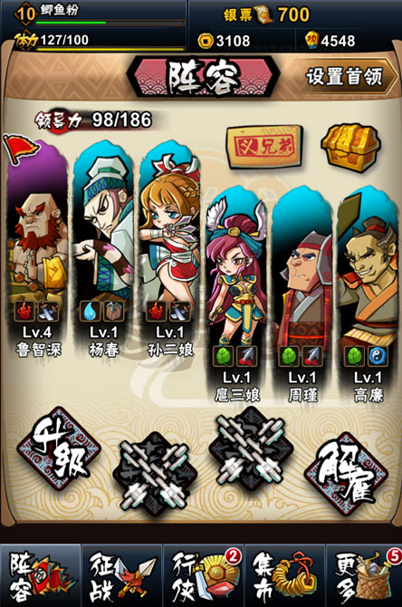 新手任务奠定了新手的核心阵容,分别是鲁智深、孙二娘、扈三娘。新手任务过后才3-4级,通过副本的通关奖励、战斗俘获,以及招募而来的英雄,慢慢地,你麾下应该也是变的人才济济了吧。