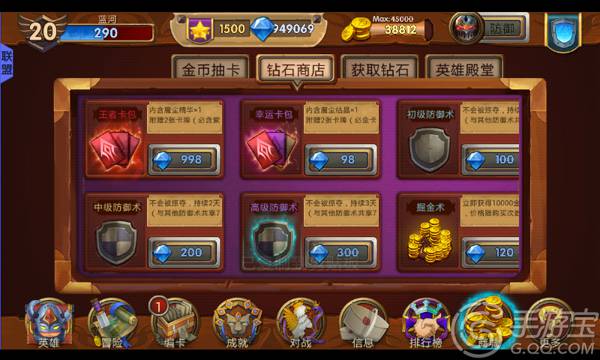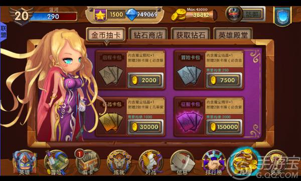 玩家进入游戏后会获得初始卡牌,之后在冒险中击败有首领镇守的据点,就会有一定几率获得首领卡牌。如果这些卡牌不能满足你的需求,可以到商店购买卡牌。商店中分为金币抽卡和钻石抽卡两种。金币抽卡包括:启程卡包、冒险卡包、征战卡包、征服卡包四种,只需要花费一定的金币和战绩点数就能获得属性比较不错的卡牌,推荐新手玩家尝试。钻石抽卡包括:王者卡包和幸运卡包,前者必定包含紫色卡牌,后者必定包含金色卡牌。如果普通卡牌已经无法满足你的征服欲可以来这里抽取。