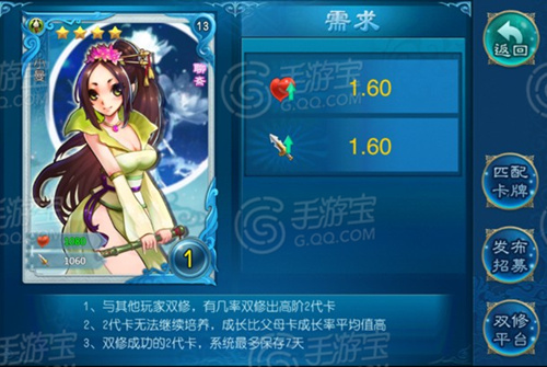 《有仙气》有一个特色玩法,就是“卡牌双修”。在玩家达到26级后,即开启卡牌双修。玩家可以将培养过后的强力卡牌,发布到双修平台后与其他玩家进行匹配双修,双修后将得到2代卡牌,2代卡牌不仅有更强大的数值潜力,卡牌原画将变得更加精致。这让原本一成不变的卡牌收集套路,变得更加有趣。