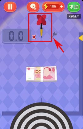 第15关通过关比较简单,因为钱藏在镖盘后面,大家只需用飞镖将绳子镖断即可。控制好下方跟右边的指针方向。