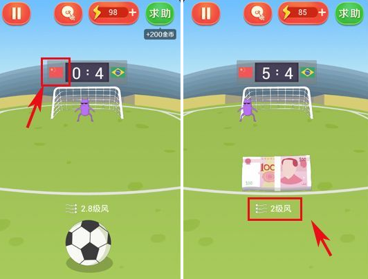 点球大战这关大家一定很郁闷为什么要帮日本队赢巴西队呢?其实不然,通过秘籍在于一进入后,大家先将日本队的国旗换掉,换为中国队,中国对必胜嘛。然后大家再按照风向跟风力计算角度,很简单就能赢。