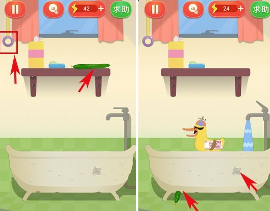 破旧的浴缸在页面版时,小编曾教过大家,大家只需先拉窗帘旁的拉线,会掉下一个青瓜出来,拿青瓜去堵最下方的漏水孔。然后点击水龙头开始放水,在放到一定程度的水时,水会从中间的漏水孔流出来,这时大家只需要用手点击屏幕,堵住该漏水孔即可。