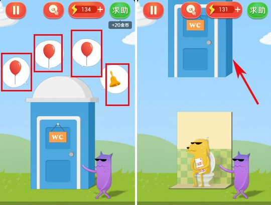 疯狂来找钱第12关比较简单,大家只需要将里面的道具全部变成气球即可,气球会把公共厕所吊起来。