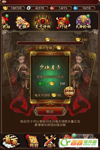 有月卡:无需经常充值,方便。只需一秒,一键扫荡光明顶;每日登录送元宝,无需担心没元宝抽五星。(爽啊)