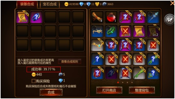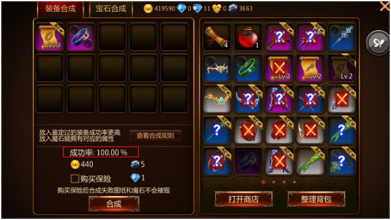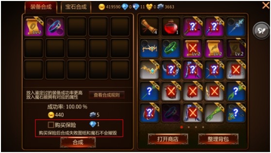 大家都知道合成装备时,如果失败了不光消耗的道具会消失,就连图纸也会一并消失,在这里只要勾选上合成界面的“购买保险”假若合成失败,消失的只是消耗的合成道具,图纸不会消失哟。