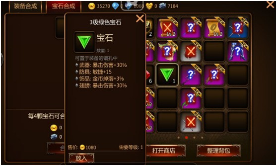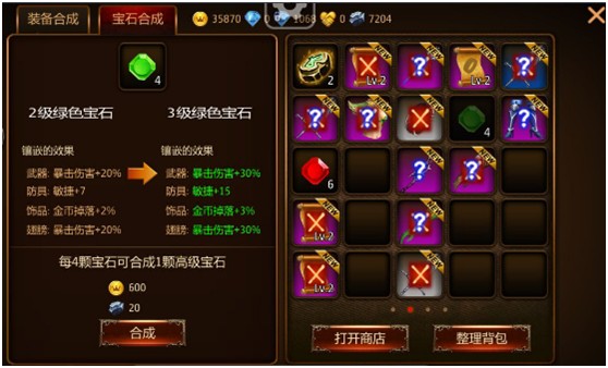 装备合成不仅可以合成装备,还可以把4颗相同属性的宝石合成1颗更高级的宝石,举例比如我有4颗1级红色宝石,通过合成我可以把这4颗1级红色宝石合成1颗2级的红色宝石,是不是很厉害呢,嘿嘿!