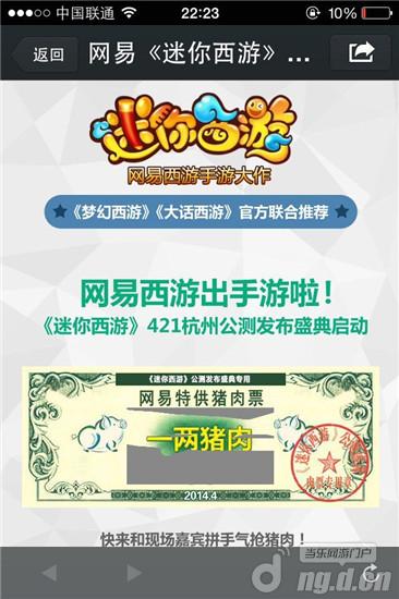比如大家都吃过猪肉,但是却不知道丁家猪肉到底是什么口味。《迷你西游》做了刮猪肉票的活动,特供了一批丁家猪肉来为游戏造势。