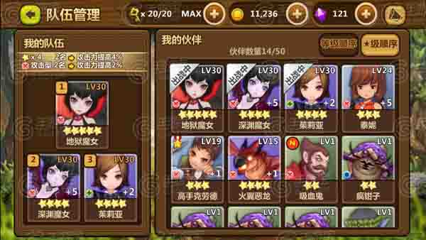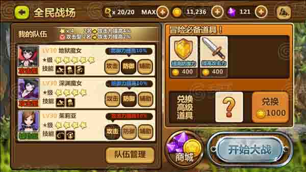 入场前要对我们的队伍进行进一步的调整。这里对于附加属性的选择不能以小伙伴的类型为准,要以小伙伴入场所要发挥的作用为准。让魔女加防/生命值,是为了增加生存的时间,来争取更多的时间来控制敌方。茱莉亚则可以一边辅助一边输出。