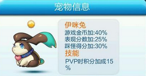 依咪兔的属性是表现分数加:25%、踩怪得分加:30%、飞行得分加:30%。