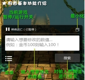 该软件通过修改正在运行的游戏的内存数据,达到修改游戏中的金钱,血量、得分、道具数量等参数值。既简单又实用