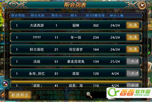 2、可以申请到其他玩家的帮派,我们可以点击帮派,现在会看到很多帮派的选项,这时候点击一个帮派进行“申请”通过审核后我们就加入了这个大家庭,同时会玩的帮主会根据你的贡献来给你一定的官职。