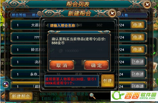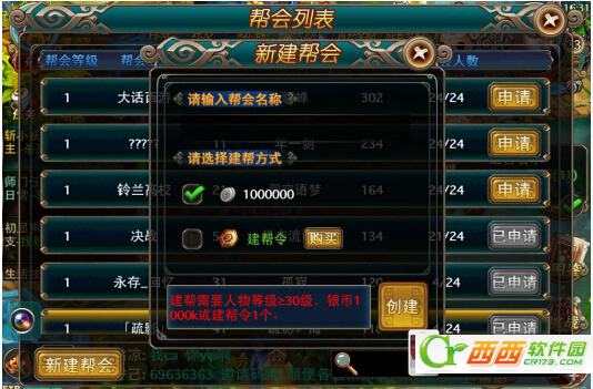 2.创建帮会需要100万银币或者建帮令(可以在商城购买)