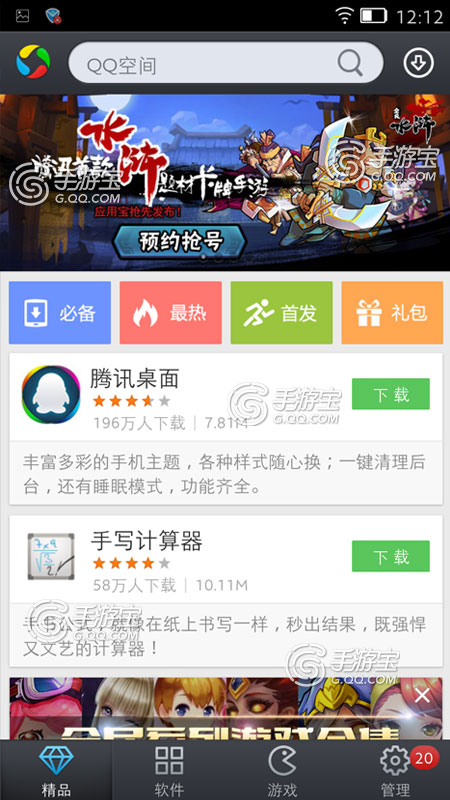 下载《应用宝》,并进入应用宝首页,点击《全民水浒》,选择一个适合自己的抢号方式,抢号成功之后便开始自动下载。下载完成之后安装游戏,之后玩家便可进入游戏,体验《全民水浒》带来的乐趣。