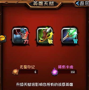 新加的天赋系统是在卡牌里面,进去以后的界面就是分为三个选择的,分别为敏捷、力量、智力。大家还要注意一个细节,那就是无畏印记很可能是一种特殊的货币,大家要及时关注。