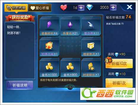 首先说明一下,只有钻石祈福才有可能抽到橙装匣子。每一次祈福需要耗费10个钻石。(贵族连抽10次可以节省10个钻石)