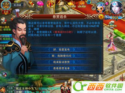 1、在天启城水归海[8,163]处可发布悬赏信息