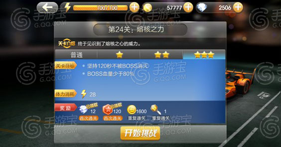 这个关卡特点是boss不会被玩家在限定时间内消灭,而且自从进关卡后右上角即开始倒计时,而且无论选择什么武器什么车到达boss前的时间是相等的,此时武器开始攻击boss。