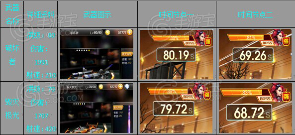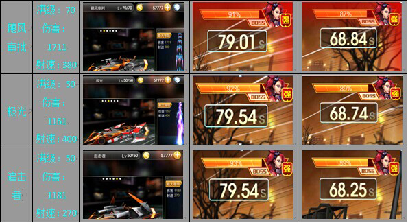 为保证各项武器攻击能力情况的准确,保证每一发子弹均完全命中boss,根据右上角的倒计时选择了两个时间节点进行截图对比,这两个点分别是80s和69秒。通过这两点,我们可以清楚的看出随着时间推移,武器对boss伤害差距扩大的程度,6种武器,依据对boss伤害程度将它们分为三类,经过不懈努力,最终得到了下表: