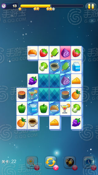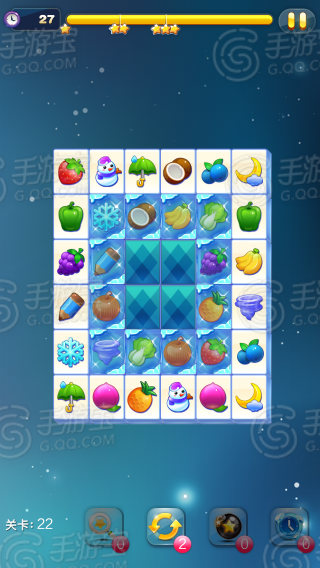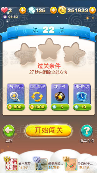 第22关要求27秒内消除全部方块。如果想获得三星判定的小伙伴就要卡在10秒左右全部消除掉!总体来说还是有一些难度的,所以建议玩家多买几个“重新整理”道具备着!