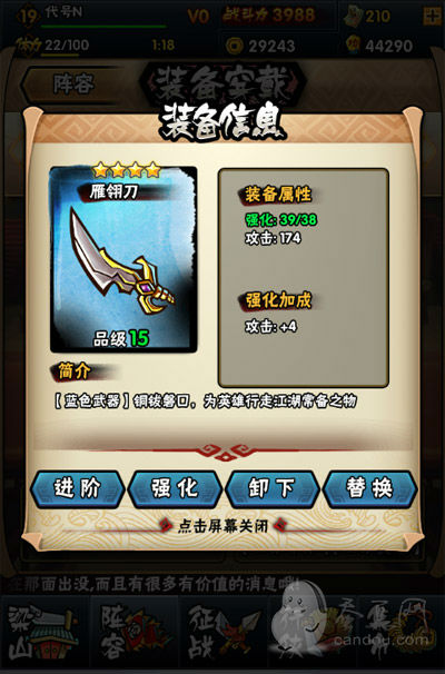 第三步:点击武将身上穿戴的装备,你就可以看到下图所示,可以把装备卸下、进阶、升级等操作。