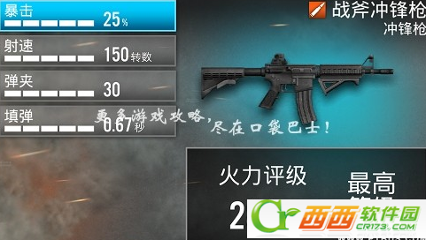 属性明细:暴击25%;射速150转数;弹夹30;填弹0.67秒
